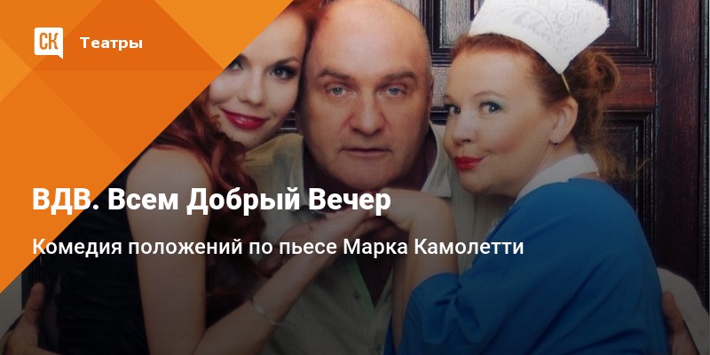 Комедию по пьесе французского писателя Марка Камолетти «ВДВ. Всем Добрый Вечер» представит плеяда знаменитых российских актеров: Александр Балуев, Глеб Матвейчук, Татьяна Абрамова, Валерий Яременко, Владимир Виноградов.