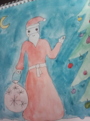 На рисунке Дед Мороз который пришёл нарядить ёлку