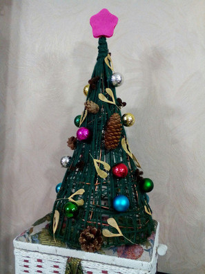 Наша чудесная и волшебная новогодняя ёлочка. Выполнена из проволоки (каркас), ниток для вязания (хвоя), природного материала (шишки еловые, сосновые, ольховые и пр.), украшена маленькими шариками и звездой из погремушки и фетра. Фантазия разыгралась)))