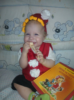 Матвей 9 мес. Наш костюм "Буратино". На фото сын доедает 😊нос(фото с носом, к сожалению ,сделать не успели)