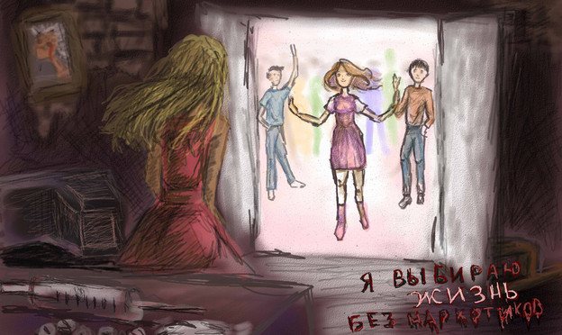 На рисунке девушка выбирает жизнь в обществе вместо наркотиков