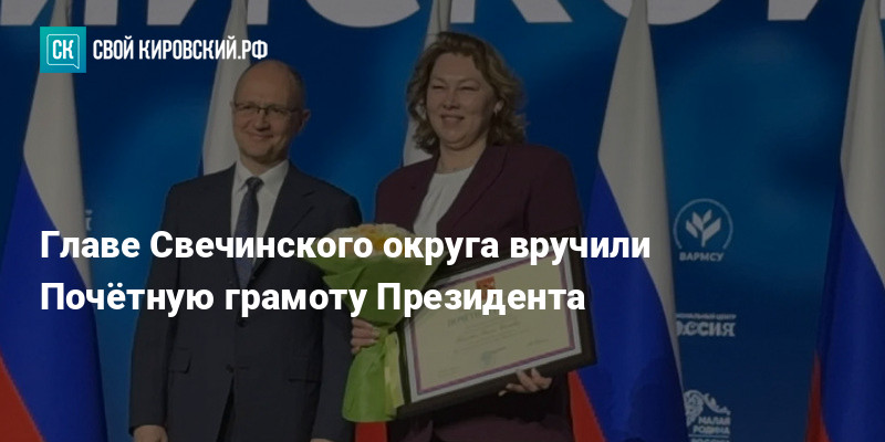 Главе Свечинского округа вручили Почётную грамоту президента. Награду Галине Гоголевой передал первый замруководителя администрации президента Сергей Кириенко на открытии форума «Малая Родина — сила России» в Москве.