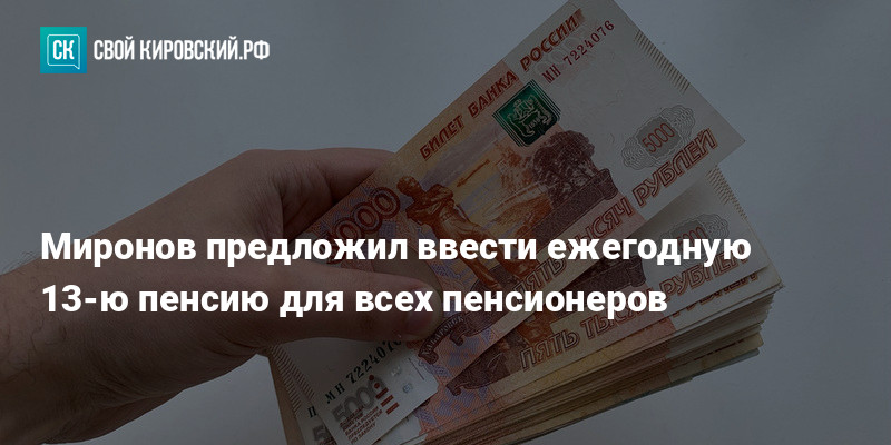 Лидер партии «Справедливая Россия» Сергей Миронов выступил с предложением ежегодно выплачивать всем пенсионерам дополнительную, 13-ю пенсию. По его словам, такая мера поможет компенсировать отставание пенсий от реальной инфляции. Об этом пишет РИА Новости.