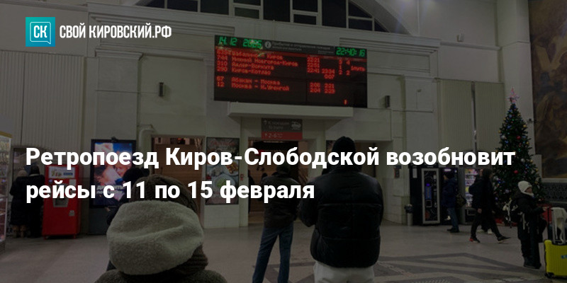 Ретропоезд на историческом локомотиве с удобными вагонами курсирует по маршруту Киров – Слободской с 11 по 15 февраля. Отправление каждый день в 09:50 с вокзала Киров – Котласский. Время в пути – 1,5 часа.