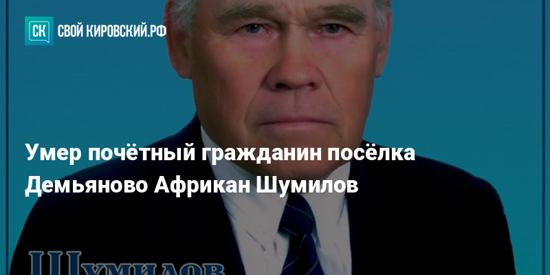 Администрация Демьяновского городского поселения сообщила, что 11 апреля на 91-м году жизни скончался Африкан Евлампиевич Шумилов. Он был почётным гражданином посёлка и одним из его первых строителей, всю жизнь посвятил железной дороге.