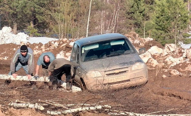 Люди вынуждены рубить деревья и подкладывать их под колёса, чтобы тронуться. Дорога грунтовая, её каждый год размывает, но проблему усугубляют большегрузы, которые игнорируют ограничение в 8 тонн.