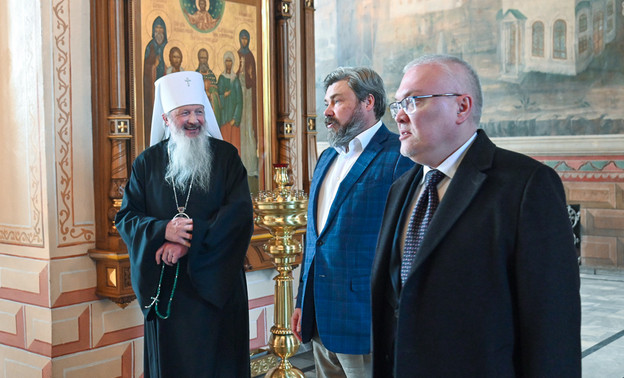 В Трифоновом монастыре гостей встречал митрополит Марк. Владыка рассказал Малофееву о главных святынях обители: Вятском образе Спаса Нерукотворного (его называют «Вятский Спас») и образе святителя Николая Чудотворца «Можайский».