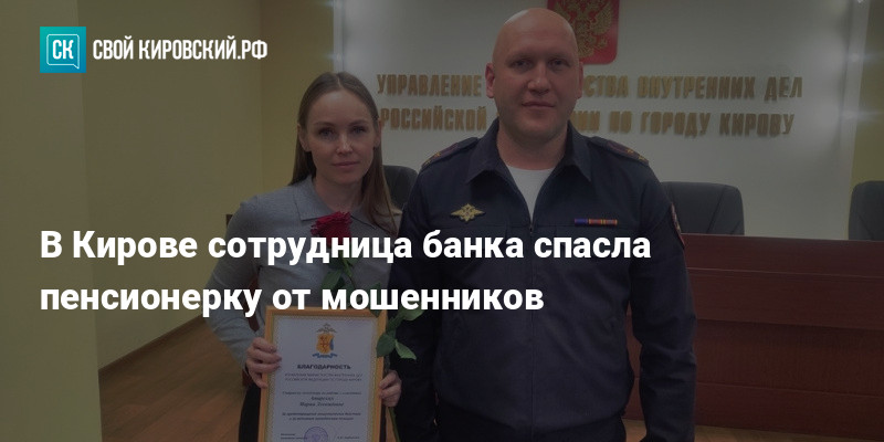 Начальник УМВД России по Кирову Алексей Бердинских вручил благодарственное письмо менеджеру банка Ольге Малыгиной. Она и её коллеги недавно предотвратили попытку хищения денег у пожилой жительницы города.