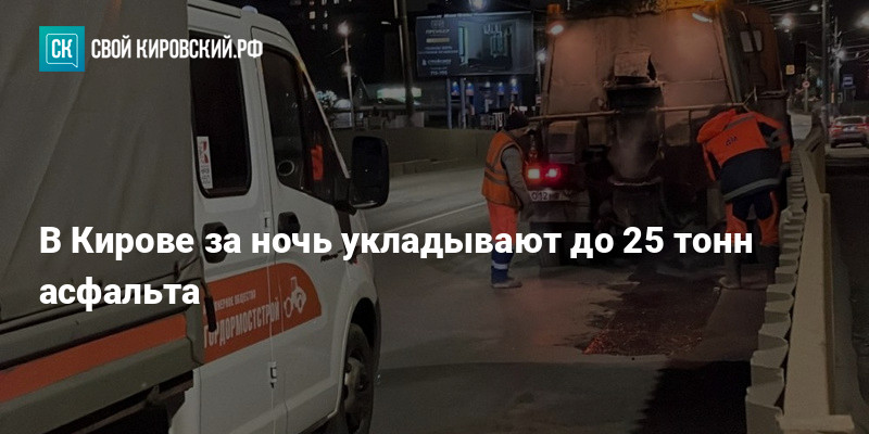Ямочный ремонт на улицах Кирова продолжается. Работы проводят каждую ночь. Бригады используют 20–25 тонн литой асфальтобетонной смеси за смену. Всего после возобновления ремонта уложили почти 800 тонн материала. Качество проверяет куратор от дирекции благоустройства.