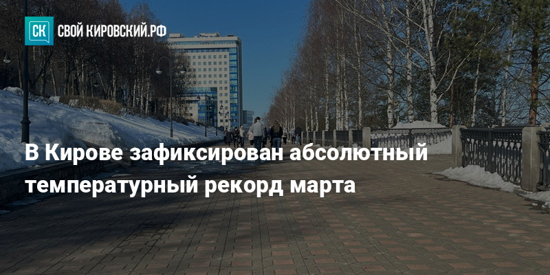 Конец марта принес в Киров аномальное тепло. В субботу термометры показали плюс пятнадцать и шесть десятых градуса. Эта цифра стала новым абсолютным максимумом для первого месяца весны за всю историю метеонаблюдений в городе.